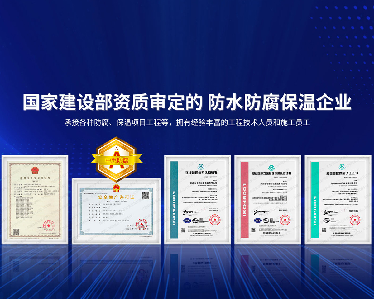 公司經營范圍:防水防腐保溫工程;消防設施工程;建筑裝修裝飾工程;建筑機電安裝工程;電力工程;建筑工程;石油化工工程;工業清洗工程;油罐清洗工程;鋼結構工程;環保工程;模板腳手架工程;電纜防火封堵、防污閃噴涂、外墻外保溫工程;各類施工勞務作業;設備維修、船舶鉚焊、涂裝;電力工程材料、建材、防水材料、防火材料、防腐保溫材料銷售,并相繼通過了GB/T19001-2008idtISO9001:2008GB/T50430-2007質量管理體系認證證書。GB/T24001-2004idtISO14001:2004環境管理體系認證證書。GB/T28001-2011idtOHSAS18001:2007職業健康安全管理體系認證證書。公司是中國防腐蝕于防護協會、中國施工企業管理協會、電力協會和中國鋼結構防水協會會員單位。 公司的經營業務涵蓋了石油、化工、電力、冶金、煤炭、船舶、國防、燃氣、水利、環保、交通運輸、航空及國防軍工和輕紡市政等行業的防腐保溫絕熱設備。鋼結構安裝、防火、防水、金屬噴鍍、聚脲噴繪、陰極保護、防滲透堵漏、玻璃鋼及各種磚版材料襯里、橡膠襯里、煙氣硫和耐酸溶劑腐蝕等工程施工。公司連續十年榮獲“省市先進施工企業”“安全生產先進單位”“重合同,守信用企業”和“AA***資質企業”的稱號。2000年被命名為市級文明單位,2002年被國家工商行政管理局命名為“重合同,守信用的企業”、被中國工業防腐蝕技術協會命名為“防腐蝕企業,能源節約及環境保護領域有豐富的經驗和***的業績。工程一次交驗合格率100%。其中攀枝花鋼鐵公司煉鐵廠四號高爐及熱風爐防腐工程、上海寶鋼公司煤氣柜防腐工程、撫順石油一廠裝置防腐項目、齊魯石化公司稀烴廠高塔防腐工程、吉林化學工業公司煉油廠油罐防腐工程、天津石化熱電廠六號爐頂棚聯絡管保溫工程、大慶油田(太倉)力神泵業工程、中國化學工程第十一建設工程、中原油田勘探局工程、中國石化銷售有限公司華北分部、魯皖輸油管道工程、貴州開磷息烽合成氨工程、陜西黃陵煤化工程、中國石油天然氣西部管道塔里木輸油工程、邯鋼集團邯寶鋼鐵公司煉鐵工程、德州供電工程、吉寶(南通)船廠工程,偃師華潤熱力工程、鄭州熱力總公司。 河南省中惠防腐安裝有限公司愿以豐富的施工經驗,***的技術,***的設備,***的管理,***的服務,竭誠為國內外廣大的用戶提供***滿意、******的工程作品。 我公司愿與國內外同仁一道,團結協作,共同推進防腐蝕行業發展! 公司地址:河南省長垣縣建設路北段360號 固定電話:0373-8866488 郵編:453400 網址:http://www_zhff_com_cn.koewgj.com